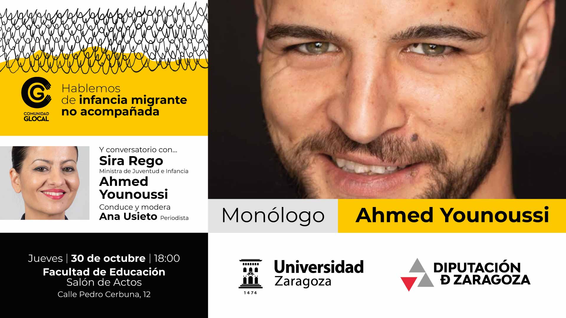 La jornada “Infancia en tránsito” cierra el programa Glocal en la Facultad de Educación el 30 de octubre y contará con la participación de la ministra Sira Rego y un monólogo del actor Ahmed Younoussi, tras abordar durante todo el mes la realidad de la infancia migrante no acompañada.